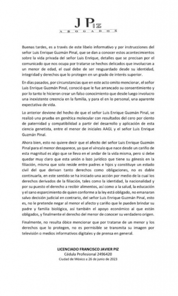 “El señor Luis Enrique Guzmán Pinal se realizó una prueba en genética molecular con resultados del cero por ciento de paternidad”, se lee en el escrito.
