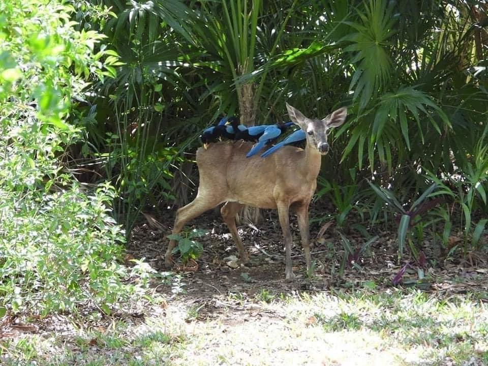 Las imágenes compartidas muestran el encuentro entre seis ejemplares de Charas yucatecas, aves endémicas de la península de Yucatán, y un venado de cola blanca, creando una escena cautivadora en el municipio de Abalá.