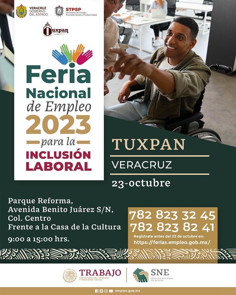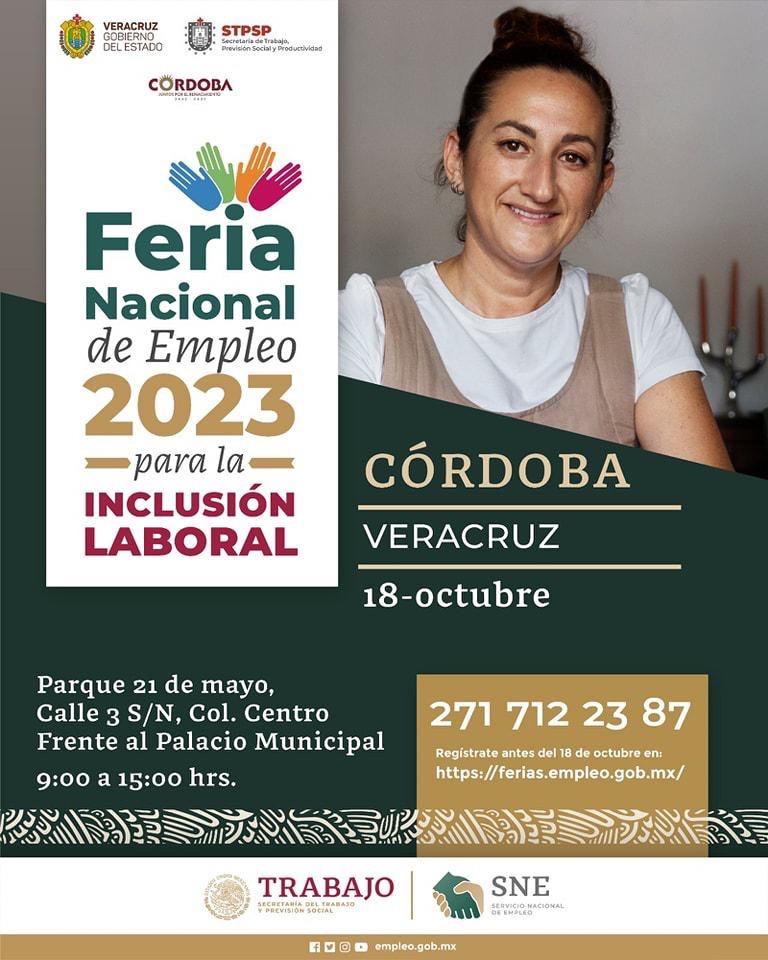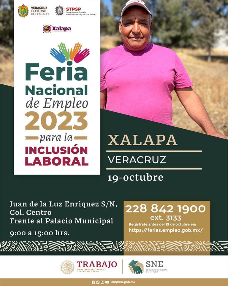 Xalapa, Ver., 17 de octubre de 2023.- Los próximos 18, 19, 20 y 23 de octubre, Córdoba, Xalapa, Boca del Río y Tuxpan serán sedes de la Feria Nacional de Empleo para la Inclusión Laboral, cuyo objetivo es acercar oportunidades que privilegian la inserción de adultos mayores, mujeres, jóvenes, personas con discapacidad y migrantes, refugiados o desplazados.