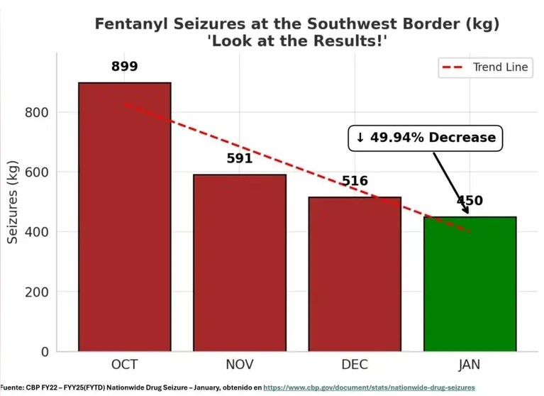 De acuerdo con la gráfica en octubre de 2024 se incautaron en Estados Unidos 899 kilogramos de fentanilo; en noviembre 591 kilogramos, en diciembre 516 y para el mes de enero de 2025 se decomisaron 450 kilos, lo que representa un decremento del 49.99%.