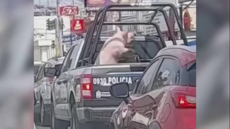 Un automovilista captó el momento en que un cerdito fue trasladado en la caja trasera de una patrulla de la policía municipal en Culiacán, Sinaloa. Se trata de la unidad 0930 de dicha corporación, la cual fue captada en el Bulevar Universitarios, al norte de la capital sinaloense.