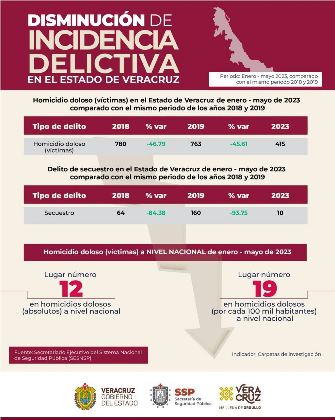 De acuerdo a la medición de la incidencia delictiva, de enero a mayo de 2023 se registraron 10 secuestros en la entidad, frente a 160 que hubo en ese mismo periodo de 2019; y 415 víctimas de homicidios dolosos, contra 763 contabilizadas en el mismo periodo de referencia.