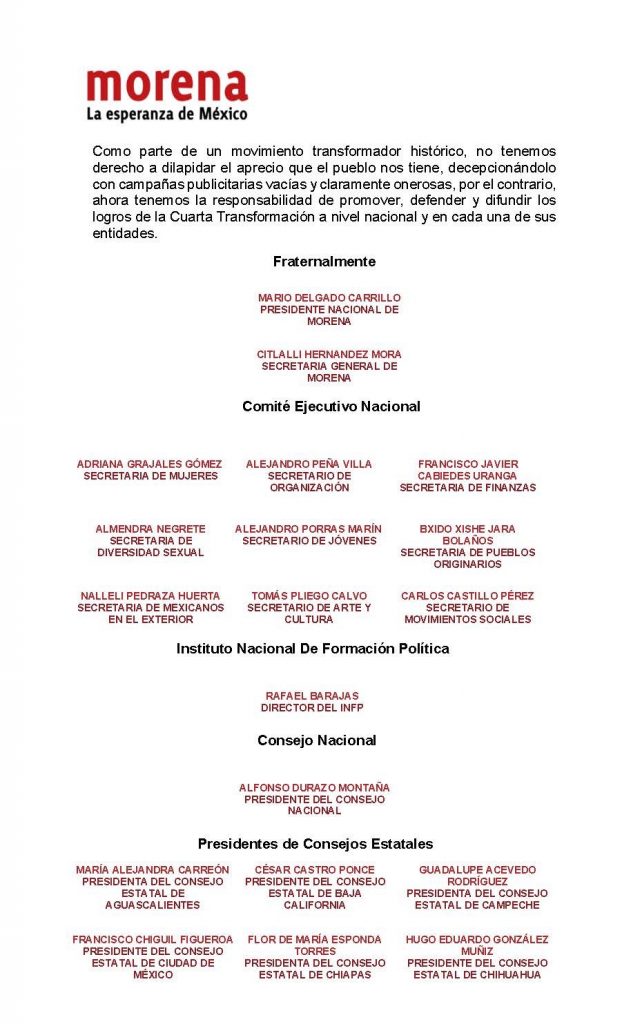 Como parte de un movimiento transformador histórico, no tenemos derecho a dilapidar el aprecio que el pueblo nos tiene, decepcionándolo con campañas publicitarias vacías y claramente onerosas, por el contrario, ahora tenemos la responsabilidad de promover, defender y difundir los logros de la Cuarta Transformación a nivel nacional y en cada una de sus entidades.”