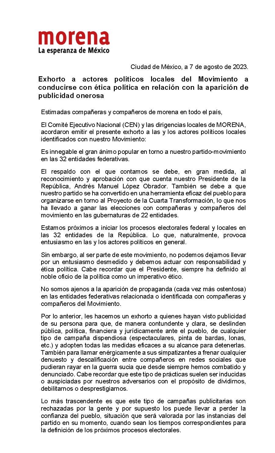 Por lo anterior, les hacemos un exhorto a quienes hayan visto publicidad de su persona para que, de manera contundente y clara, se deslinden pública, política, financiera y jurídicamente ante el pueblo, de cualquier tipo de campaña dispendiosa (espectaculares, pinta de bardas, lonas, etc.) y adopten todas las medidas eficaces a su alcance para detenerlas. También para llamar enérgicamente a sus simpatizantes a frenar cualquier denuesto y descalificación entre compañeros en redes sociales que pudieran rayar en la guerra sucia que desde siempre hemos combatido y denunciado.