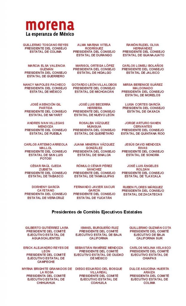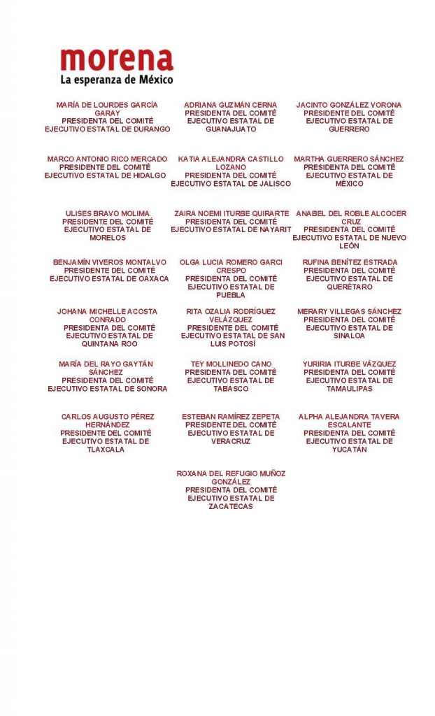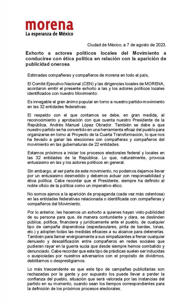 “Estimadas compañeras y compañeros de morena en todo el país, el Comité Ejecutivo Nacional (CEN) y las dirigencias locales de MORENA, acordaron emitir el presente exhorto a las y los actores políticos locales identificados con nuestro Movimiento: