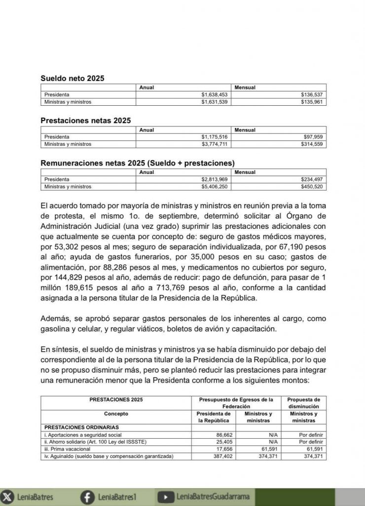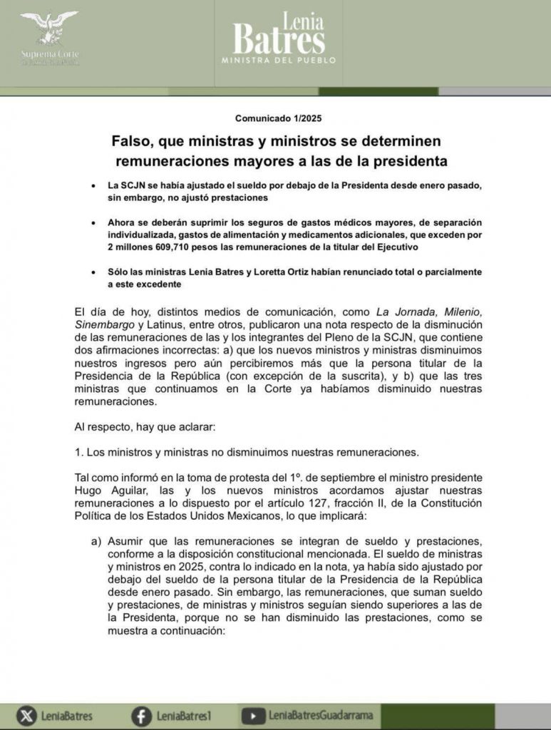 El día de hoy, distintos medios deEl día de hoy, distintos medios de comunicación, como La Jornada, Milenio, Sinembargo y Latinus, entre otros, publicaron una nota respecto de la disminución de las remuneraciones de las y los integrantes del Pleno de la SCJN, que contiene dos afirmaciones incorrectas: a) que los nuevos ministros y ministras disminuimos nuestros ingresos pero aún percibiremos más que la persona titular de la Presidencia de la República (con excepción de la suscrita), y b) que las tres ministras que continuamos en la Corte ya habíamos disminuido nuestras remuneraciones.