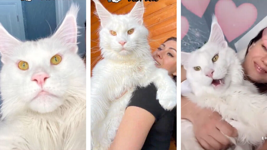 Este impresionante gato destaca por su pelaje blanco y se percibe sumamente sedoso, como con ganas de querer abrazarlo; y además, es bastante sociable, pues convive con su dueña y hasta se pone a ver la televisión como un humano más.