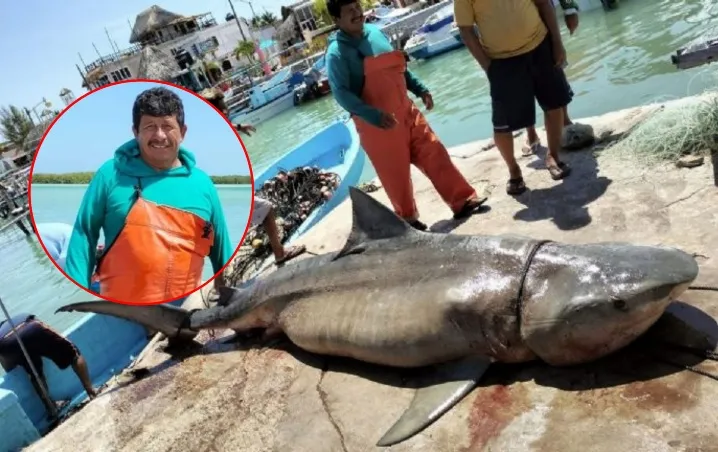 A poco más de 25 kilómetros del puerto de Rio Lagartos una embarcación comandada por Adolfo Huchim capturaron a un enorme tiburón de tres metros de largo y con un peso de 640 kilos, causando asombro entre turistas que no evitaron tomarse la foto con el enorme pez.