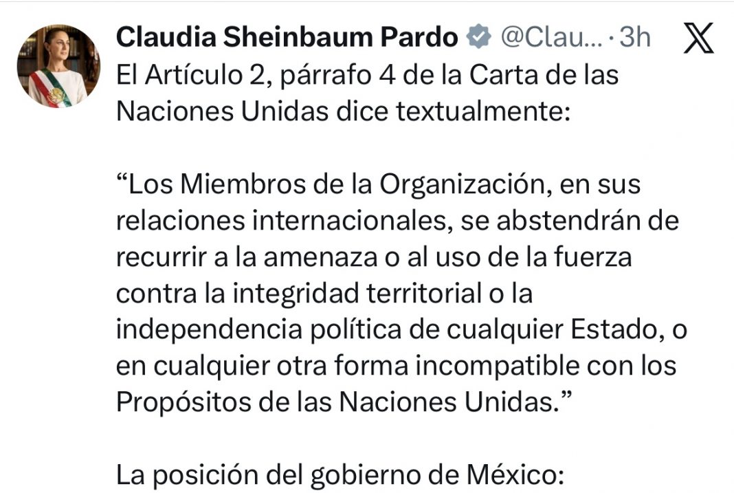 El Gobierno de México condena y rechaza enérgicamente las acciones militares ejecutadas unilateralmente en las últimas horas por fuerzas armadas de los Estados Unidos de América contra objetivos en territorio de la República Bolivariana de Venezuela, en clara violación del artículo 2 de la Carta de la Organización de las Naciones Unidas (ONU).
