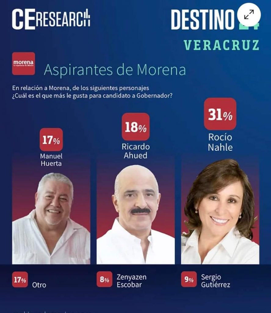 La actual Secretaria de Energía obtiene 31 por ciento del respaldo contra el 18 por ciento del presidente municipal de Xalapa, Ricardo Ahued, mientras el súper delegado federal Manuel Huerta se ubica en tercer lugar con 17 puntos porcentuales, en tanto que Sergio Gutiérrez, diputado federal, apenas alcanza el 9 por ciento de las preferencias.