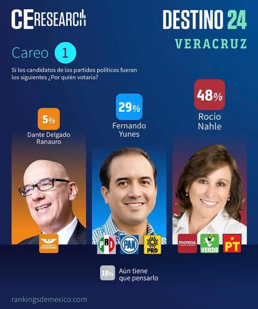 En el escenario donde los candidatos a la gubernatura fueran Rocío Nahle García, por Morena; Fernando Yunes Márquez, por la alianza opositora, y Dante Delgado Rannauro, por Movimiento Ciudadano, la intención de voto favorece a la morenista Rocío Nahle con 48 por ciento, cuatro puntos arriba de la preferencia expresada hacia el partido Morena y sus aliados.