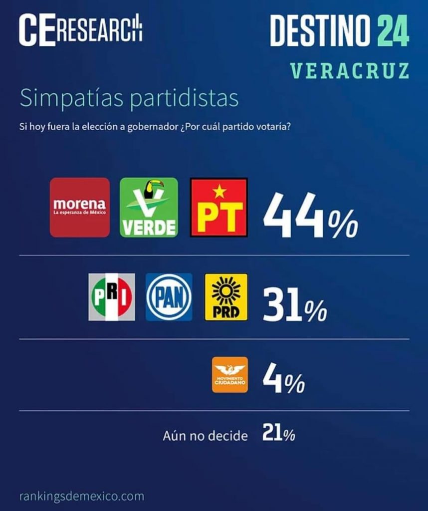 El Legislador presumió en sus redes sociales una reciente encuesta de la casa CEResearch respecto a las simpatías partidistas de las y los veracruzanos de cara al proceso electoral de 2024 en el estado, donde Morena, junto con sus partidos aliados Verde Ecologista y del Trabajo, tendría 44 por ciento de las votaciones si hoy fueran las elecciones.