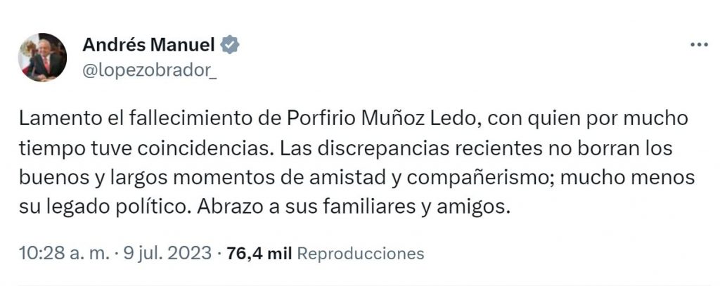 el presidente Andrés Manuel López Obrador lo recordó como alguien con quien compartió “momentos de amistad y compañerismo”.