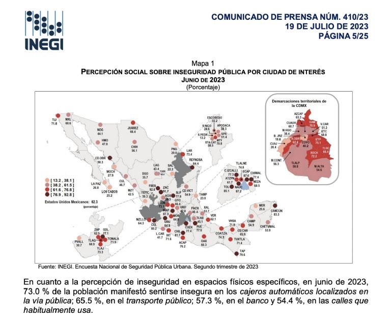 “En junio de 2023, 78.9 por ciento de las mujeres manifestó sentir inseguridad en los cajeros automáticos localizados en la vía pública. De los hombres, 66.5 por ciento respondió sentir inseguridad en los cajeros automáticos localizados en la vía pública”.