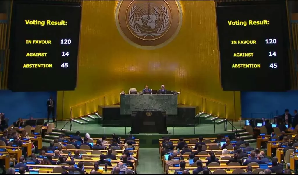 En la reunión de emergencia, los votos a favor de la resolución fueron 120, mientras que en contra fueron 14, entre ellos Estados Unidos e Israel y 45 abstenciones.