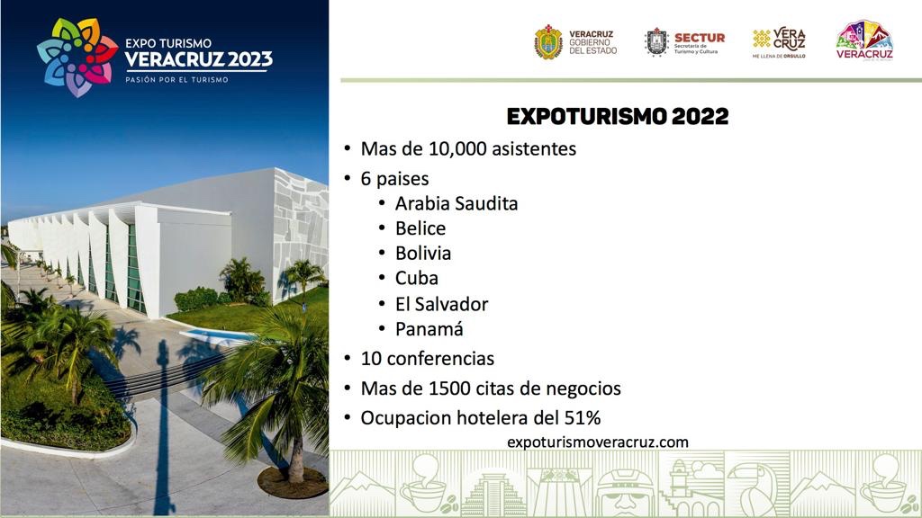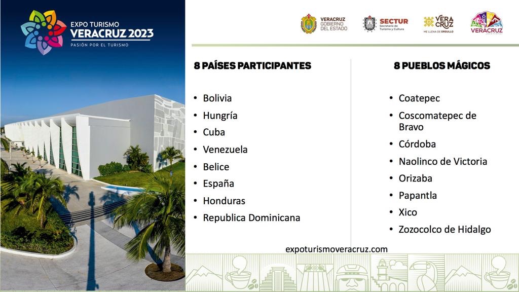 Xalapa, Ver., 19 de septiembre de 2023.- La segunda edición de la Expo Turismo Veracruz, Pasión por el turismo, llegará los días 7, 8 y 9 de noviembre al World Trade Center con la participación especial de ocho naciones y los ocho Pueblos Mágicos de Veracruz, posicionando al evento como el más importante del país en el rubro de negocios.
