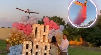 De pronto, en una zona de pasto con globos y donde se escucha a los asistentes emocionados esperando saber cuál será el sexo del bebé, se ve cuando la avioneta entra a escena y revela que se trata de una niña, al soltar polvos color rosa.